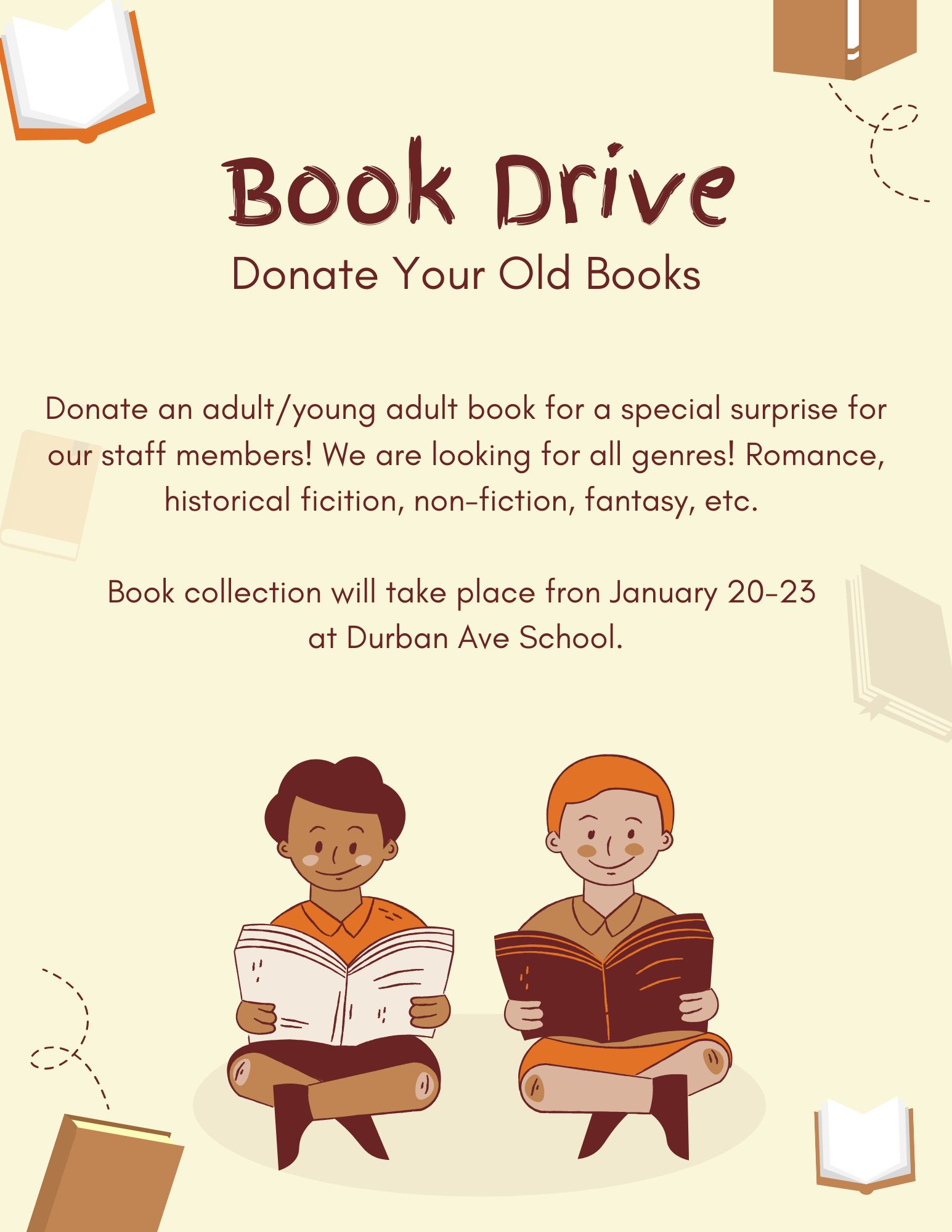 Please see the flyer! We are collecting books for a surprise for our staff members. |